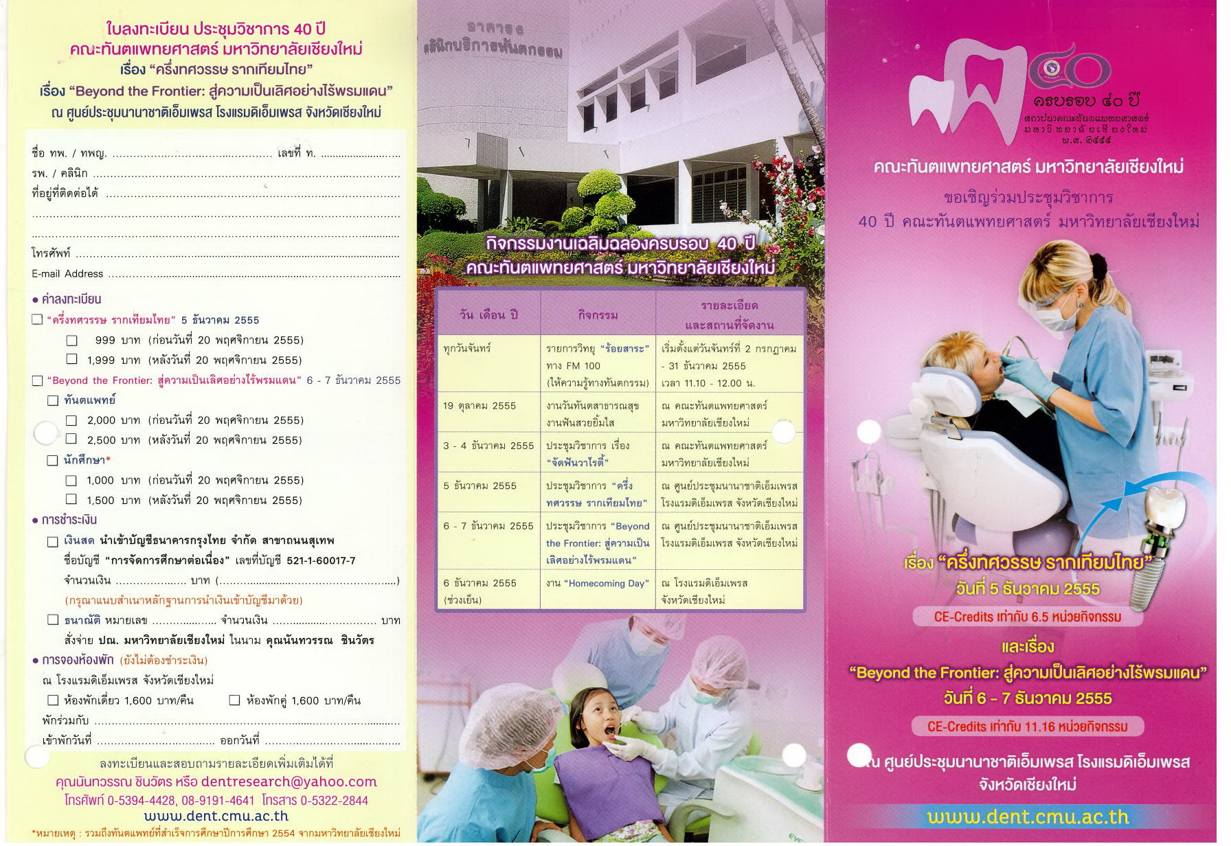 ขอเชิญทันตแพทย์ที่สนใจเข้าร่วมประชุมวิชาการ เรื่อง "The 1st DENT CMU Annual Meeting: Dentistry World for Golden Age" ในวันที่ 8 - 9 ตุลาคม 2562 ณ โรงแรม U Hotel Nimman จังหวัดเชียงใหม่