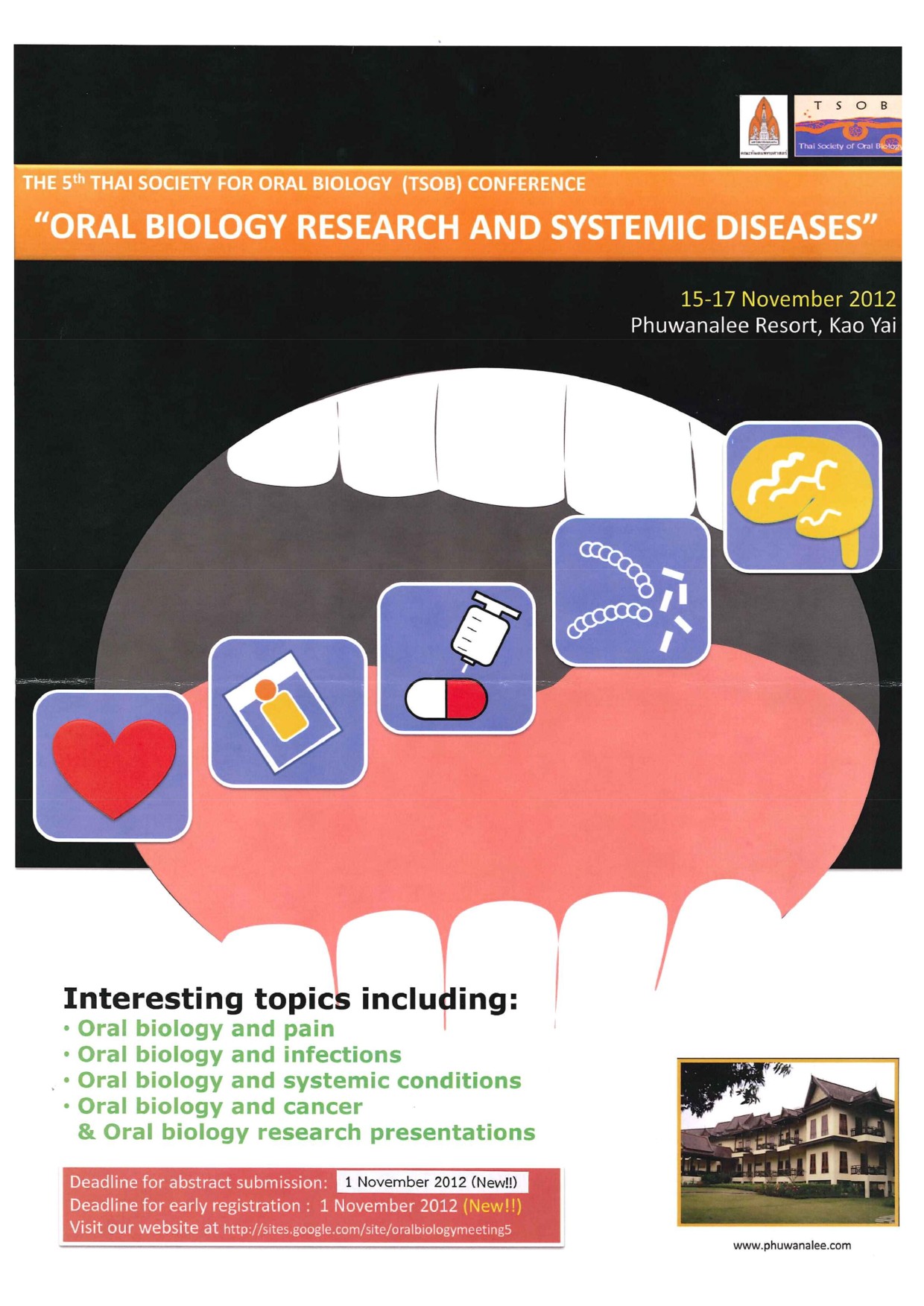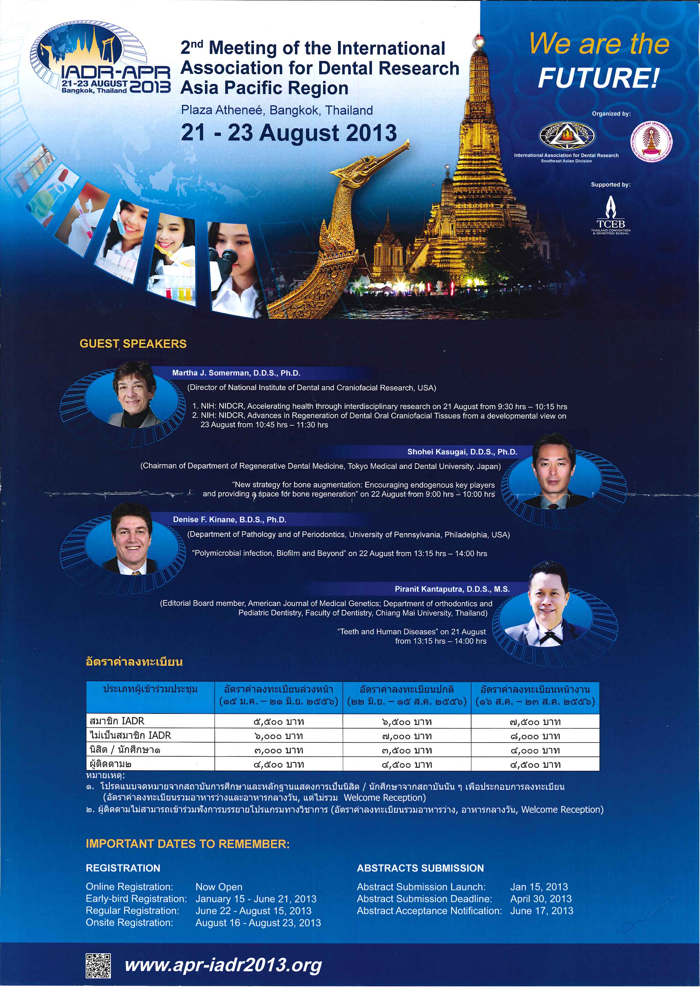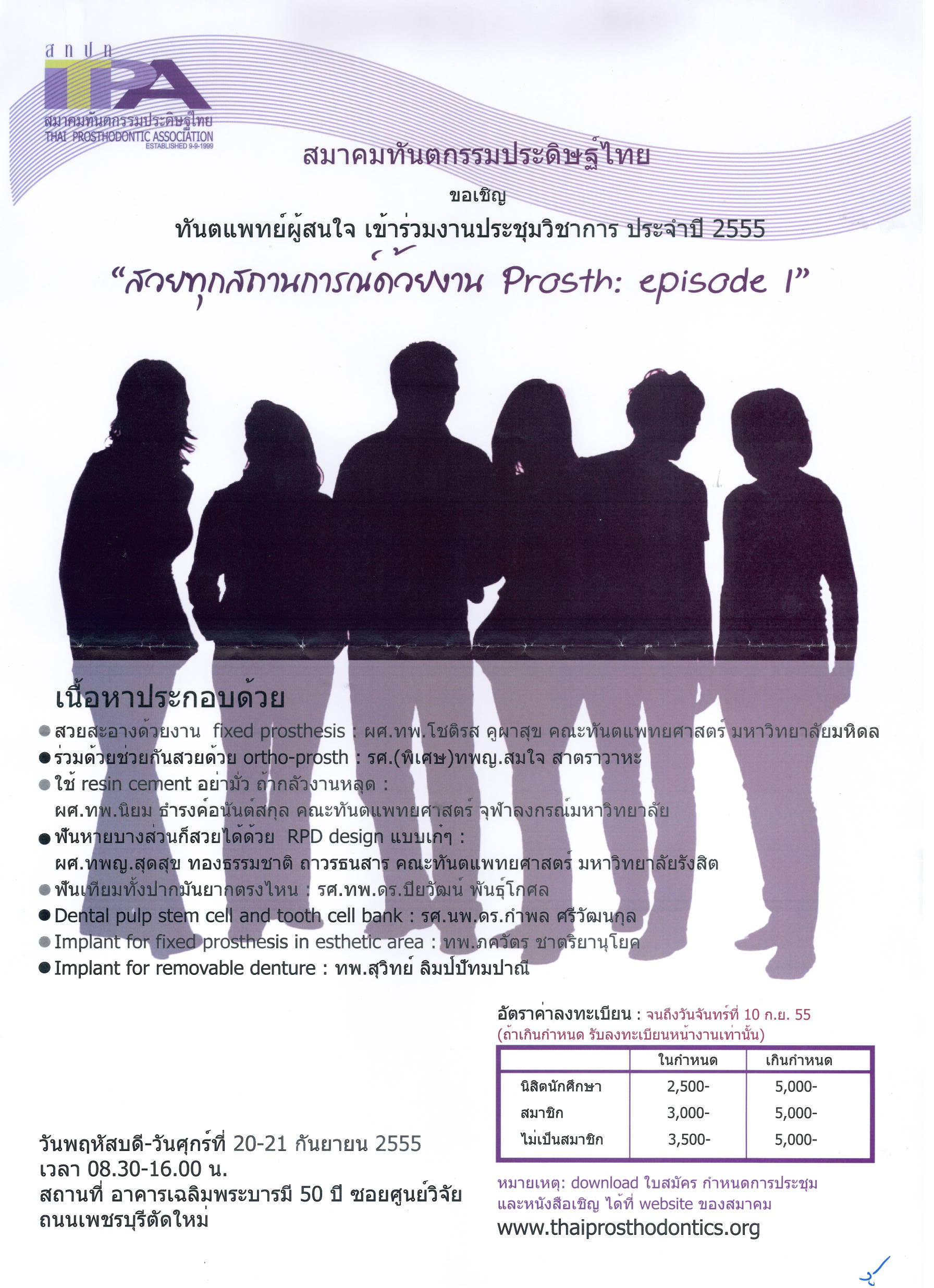 ขอเชิญเข้าร่วมโครงการประชุมวิชาการและนำเสนอผลงานวิจัย สาขาทันตแพทยศาสตร์ ระดับนานาชาติ องค์กรผู้บริหารคณะทันตแพทยศาสตร์แห่งประเทศไทย (อ.บ.ท.ท.) ครั้งที่ 21 เนื่องในโอกาสครบรอบ 30 ปี คณะทันตแพทยศาสตร์ มหาวิทยาลัยศรีนครินทรวิโรฒ