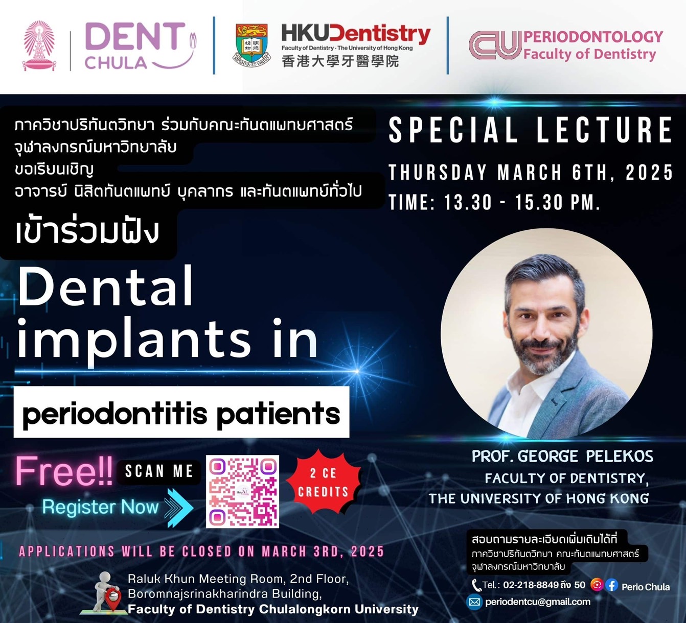 คณะทันตแพทยศาสตร์ จุฬาลงกรณ์มหาวิทยาลัย ร่วมกับ บริษัท ซียูเดนท์ เซอร์วิส จำกัด นิติบุคคลภายใต้คณะทันตแพทยศาสตร์ จุฬาฯ กำหนดจัดงานสัมนา Digital Prosthodontics in Super Aged Society ในวันที่ 5 และ 6 กันยายน 2567 ณ ห้องประชุม สีริสิงห ชั้น 2 อาคารสมเด็จย่า 93 คณะทันตแพทยศาสตร์ จุฬาลงกรณ์มหาวิทยาลัย