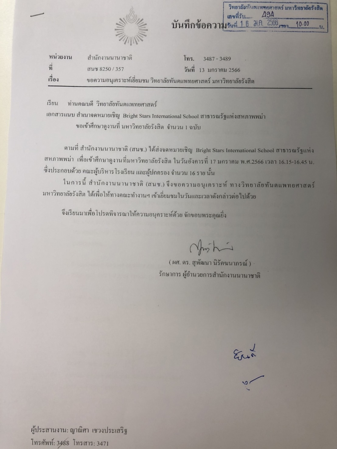 Bright Stars International School สาธารณรัฐแห่งสหภาพพม่า ขอเข้าศึกษาดูงาน ณ วิทยาลัยทันตแพทยศาสตร์ มหาวิทยาลัยรังสิต Bright Stars International School สาธารณรัฐแห่งสหภาพพม่า ขอเข้าศึกษาดูงาน ณ วิทยาลัยทันตแพทยศาสตร์ มหาวิทยาลัยรังสิต ในวันอังคารที่ 17 มกราคม 2566 เวลา 16.15 - 16.45 น. บันทึกข้อความ