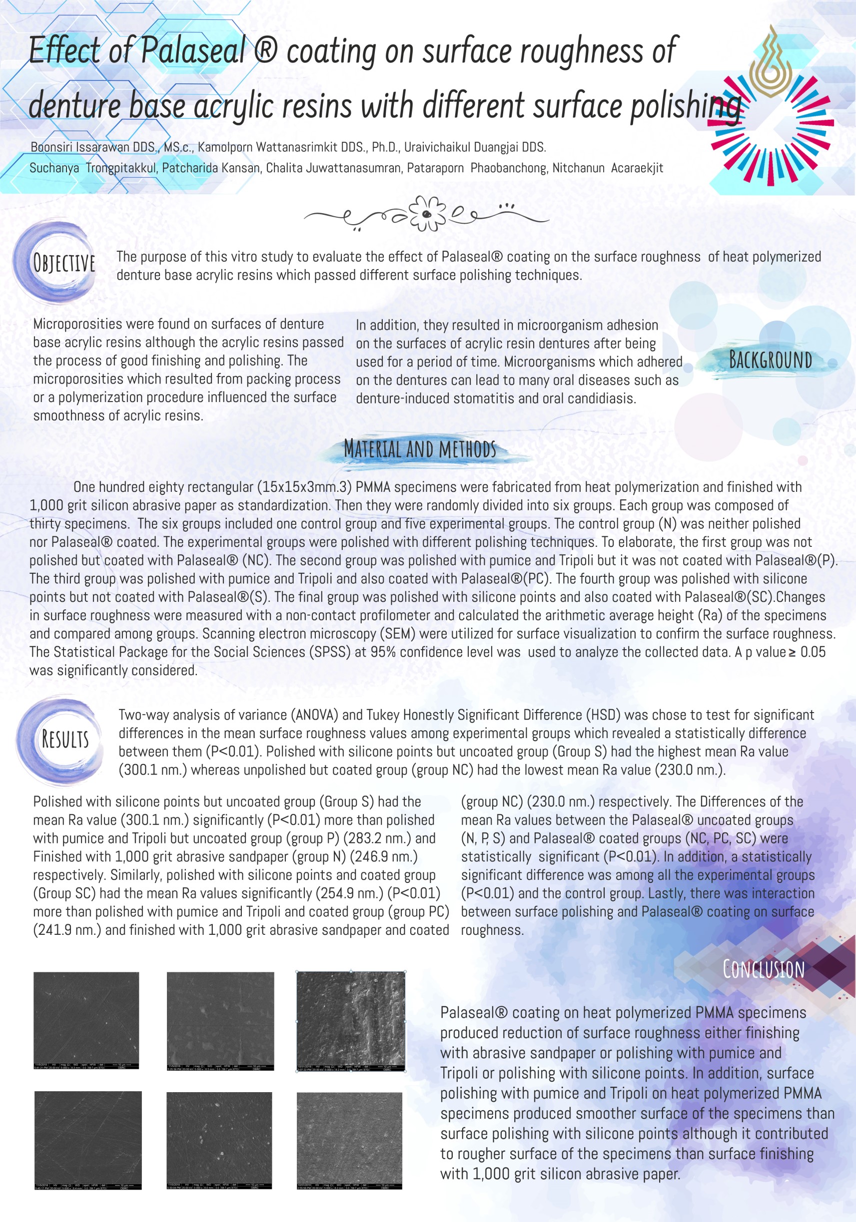 Effect of Palaseal coating on surface roughness of denture base acrylic resins with different surface polishing. Poster |