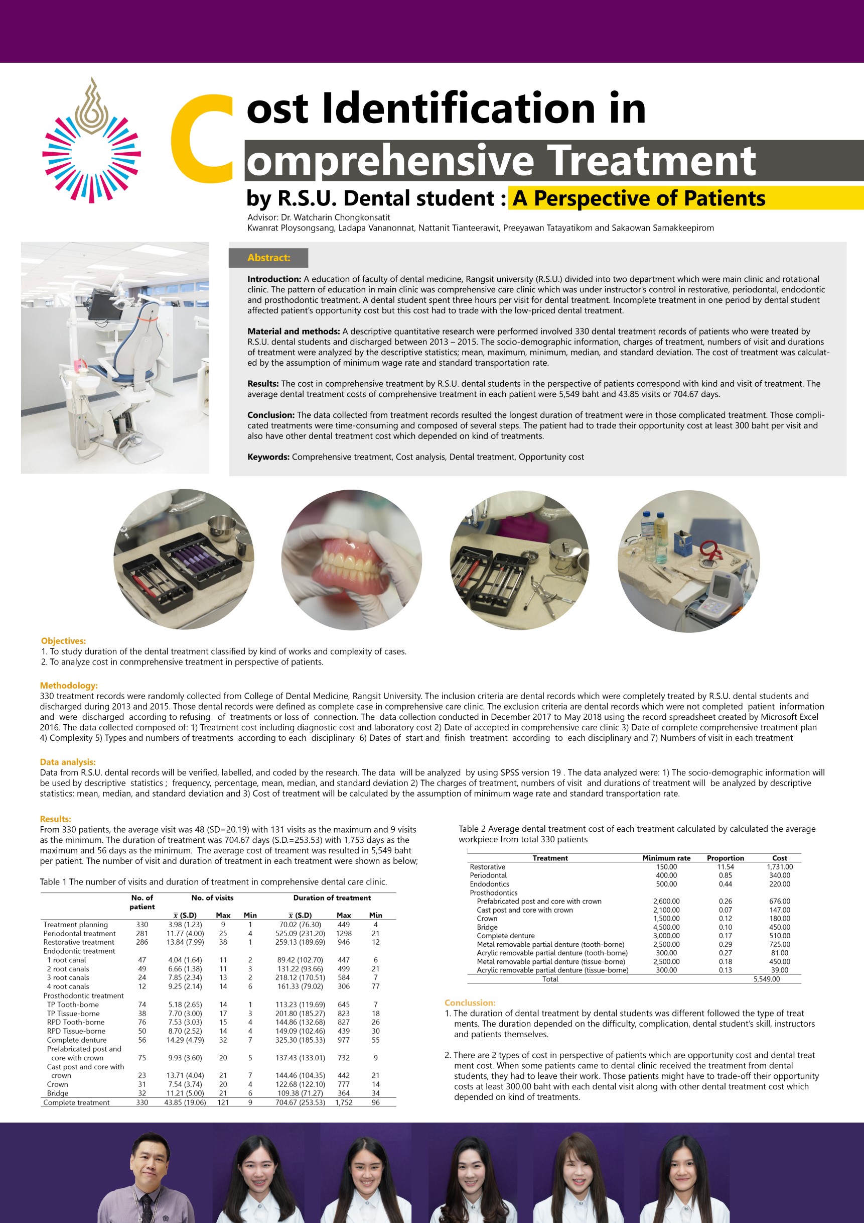 Cost Identification in Comprehensive Treatment by R.S.U. Dental Students:Cost Identification in Comprehensive Treatment by R.S.U. Dental Students:A Perspective of Patients. Poster |