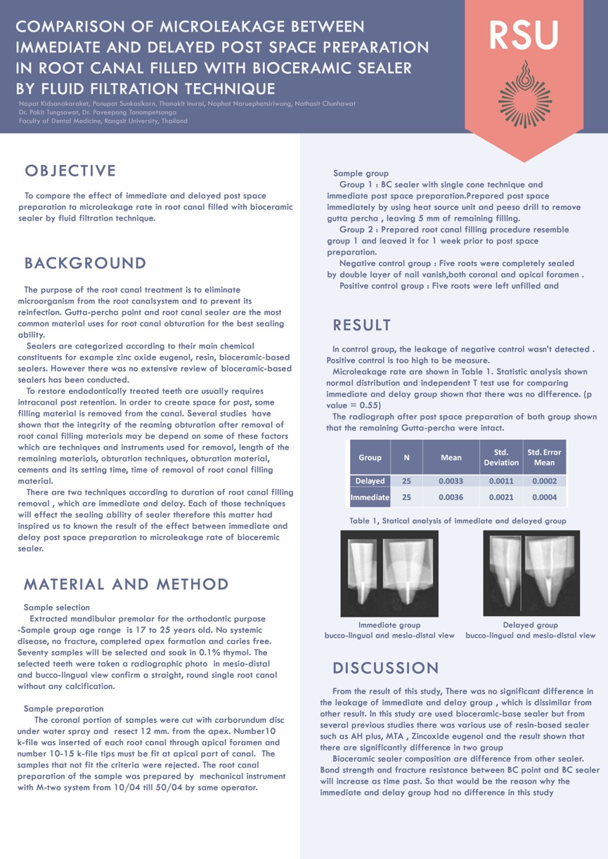 Comparison of microleakage between immediate and delayed post space preparation in root canal filled with bioceramic sealer by fluid filtration technique. Poster |