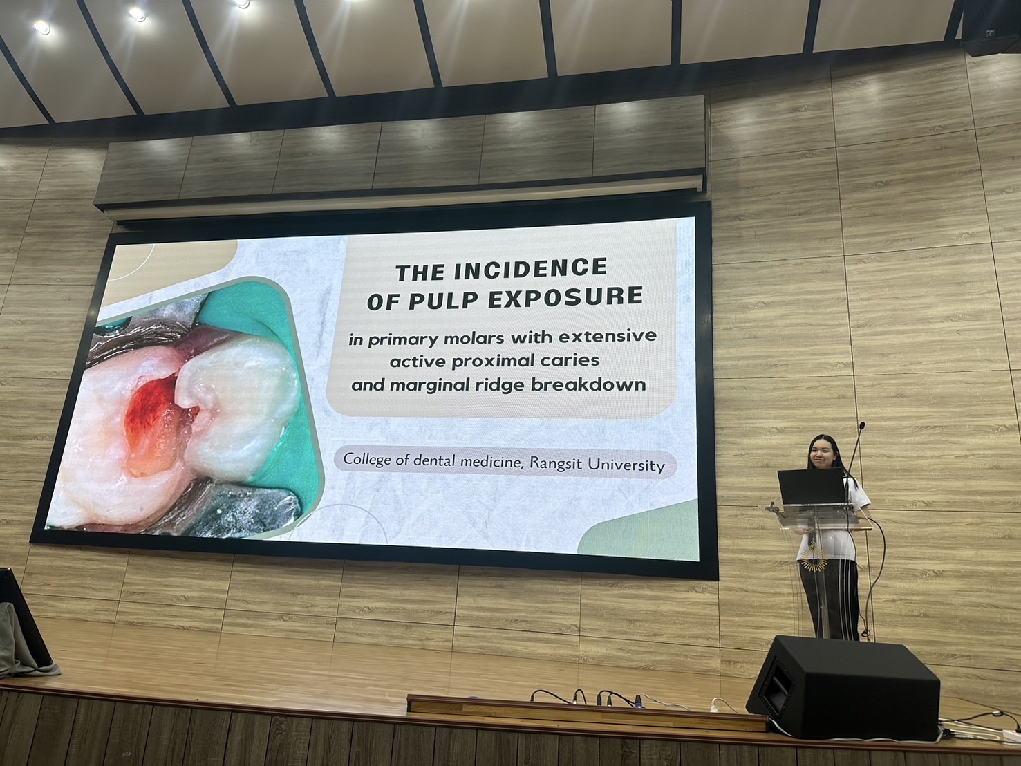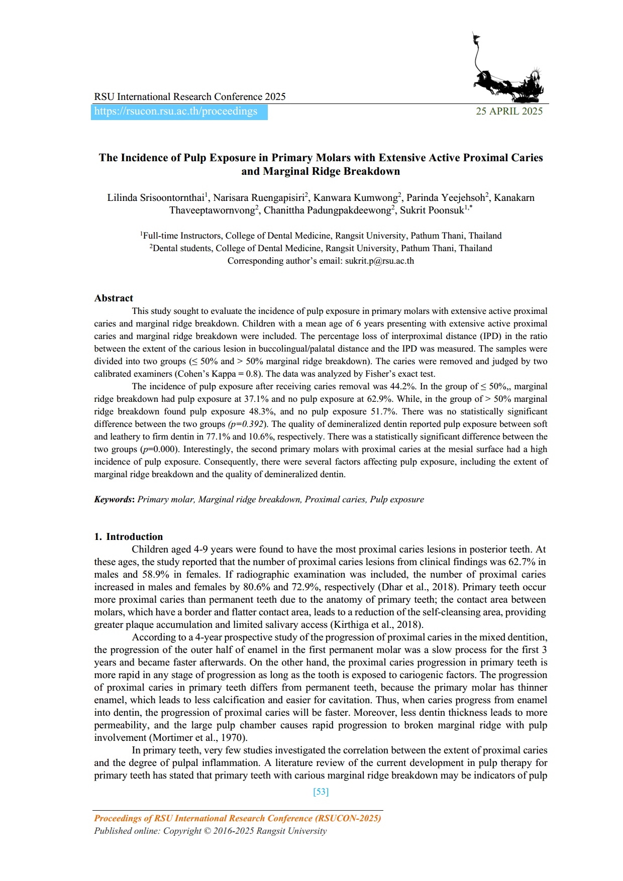 1. Title : The Incidence of Pulp Exposure in Primary Molars with Extensive Active Proximal Caries and Marginal Ridge Breakdown. abstract, photograph1, photograph2 Presenter : Ruengapisiri N. , Kumwong K. , Yeejehsoh P. , Thaveeptawornvong K. , Padungpakdeewong C. Advisor : Poonsuk S. and Srisoontornthai L. Conference : RSU International Research Conference (2025) On 25 April 2025 Award : - |
