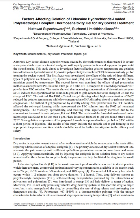 | 30. | Title | : | Factors Affecting Gelation of Lidocaine Hydrochloride-Loaded Polyelectrolyte Complex Thermosensitivity Gel for Dry Socket Treatment Abstract, Full text | ||